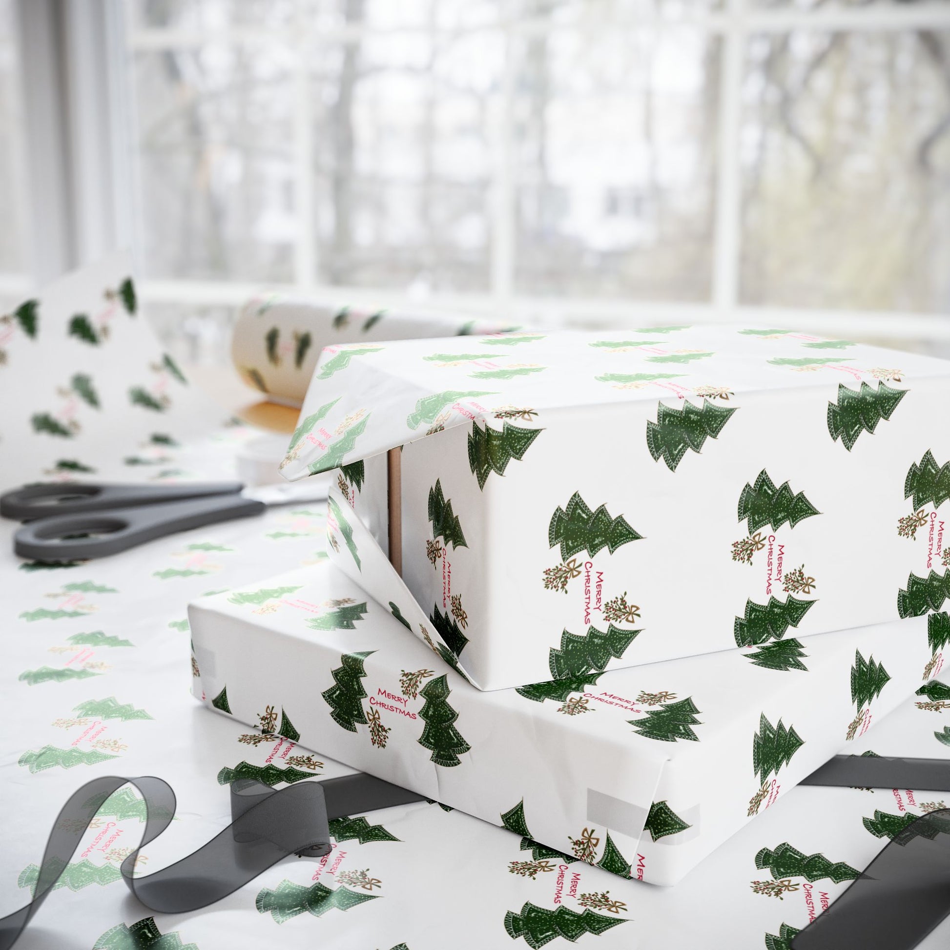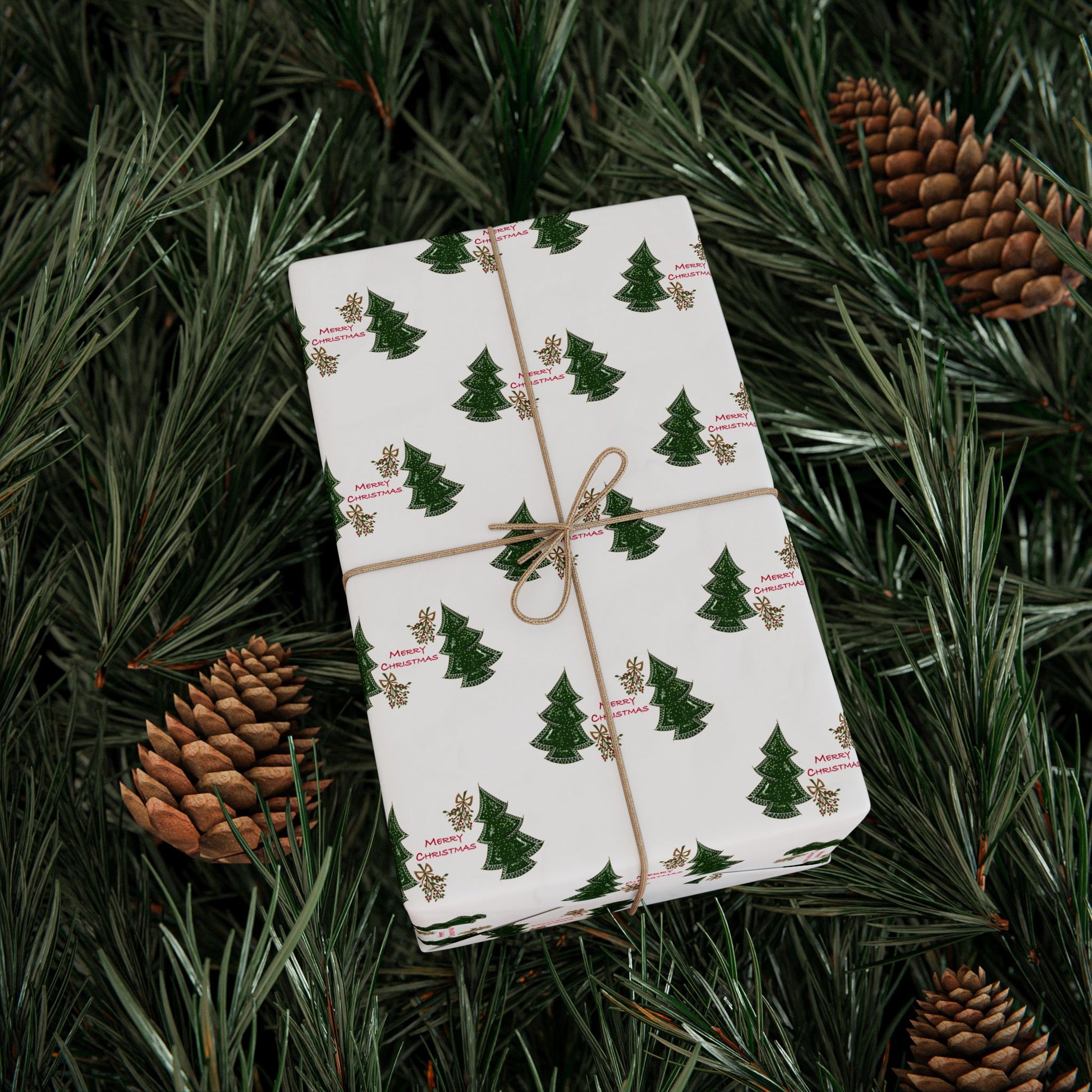 Wrap your holiday gifts in festive style with this Christmas wrapping paper featuring a delightful pattern of green Christmas trees and mistletoes. The crisp white background provides a clean canvas to showcase the vibrant holiday motifs. Crafted from 90gsm fine-art paper, this wrapping paper ensures your presents look their best under the tree. Bring the magic of Christmas into your home with this charming wrapping paper that adds a touch of seasonal cheer to your gift-giving traditions.